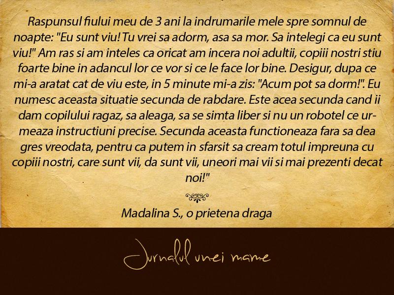 "Raspunsul fiului meu de 3 ani la indrumarile mele spre somnul de noapte: "Eu sunt viu! Tu vrei sa adorm, asa sa mor. Sa intelegi ca eu sunt viu!" Am ras si am inteles ca oricat am incera noi adultii, copiii nostri stiu foarte bine in adancul lor ce vor si ce le face lor bine. Desigur, dupa ce mi-a aratat cat de viu este, in 5 minute mi-a zis: "Acum pot sa dorm!". Eu numesc aceasta situatie secunda de rabdare. Este acea secunda cand ii dam copilului ragaz, sa aleaga, sa se simta liber si nu un robotel ce urmeaza instructiuni precise. Secunda aceasta functioneaza fara sa dea gres vreodata, pentru ca putem in sfarsit sa cream totul impreuna cu copiii nostri, care sunt vii, da sunt vii, uneori mai vii si mai prezenti decat noi!"