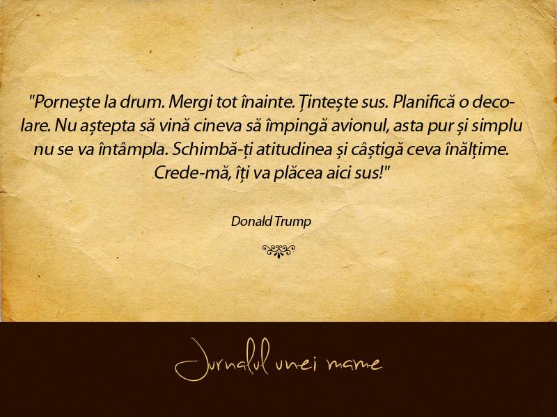 "Pornește la drum. Mergi tot înainte. Țintește sus. Planifică o decolare. Nu aștepta să vină cineva să împingă avionul, asta pur și simplu nu se va întâmpla. Schimbă-ți atitudinea și câștigă ceva înălțime. Crede-mă, îți va plăcea aici sus!"