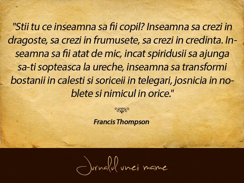 "Stii tu ce inseamna sa fii copil? Inseamna sa crezi in dragoste, sa crezi in frumusete, sa crezi in credinta. Inseamna sa fii atat de mic, incat spiridusii sa ajunga sa-ti sopteasca la ureche, inseamna sa transformi bostanii in calesti si soriceii in telegari, josnicia in noblete si nimicul in orice."